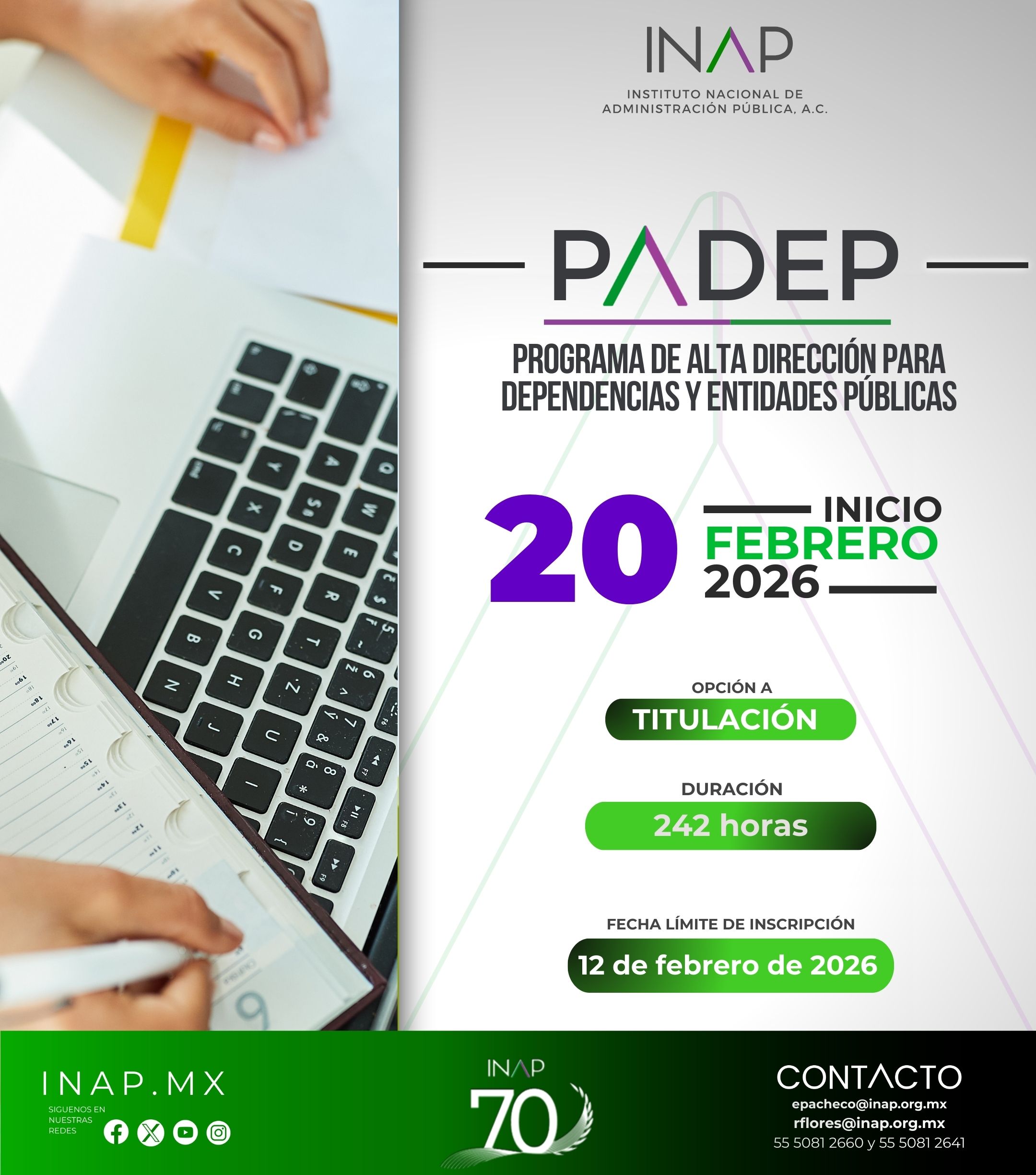 El INAP organiza el PADEP, replanteando sus áreas de conocimiento para colocarse a la vanguardia, propiciando la profesionalización de servidores públicos íntegros, capaces, austeros y honestos con una cultura de compromiso con el interés público. La Escuela Nacional de Profesionalización Gubernamental del INAP para 2026 presenta el PADEP, que ha sido el primer Programa de Alta Dirección en México, como un esfuerzo de transición para la alta dirección de organizaciones gubernamentales buscando la consolidación de la gobernabilidad y en la construcción de una democracia vigorosa, basada en normas e instituciones sólidas y mecanismos democráticos, necesarios en un estado constitucional de derecho.